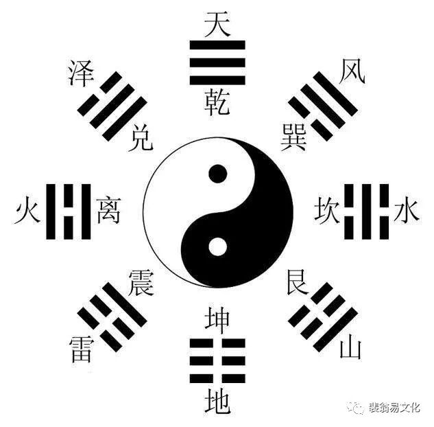八卦图最早出自伏羲所创的先天八卦(大概起始于 5 千多年前)其用阴爻和阳爻的组合来阐述天地中八种最原始的物质。后世道教将伏羲供奉为神。后天八卦出自周文王,其后天八卦只是和伏羲的先天八卦位置不同。其含义不变。直至孔子创立儒家,将周文王的易经收录为儒家经典(也就是儒家教科书)。汉朝时道家更由易经中的阴阳、八卦、五行等创出了无数的术数。是 《 周易 》 中用的八种基本图形,亦称八卦,用“-”和“- -”符号组成。名称是:乾为天卦像:上乾下乾纯阳卦;乾卦阳刚,刚健,自强不息。乾六爻皆盈滴,故肥园,圆满、亨通,成功、重大。但刚多易折,含欠安之像。人物表示为上级、领导、当官的,执法者,有钱而富贵者,司机。